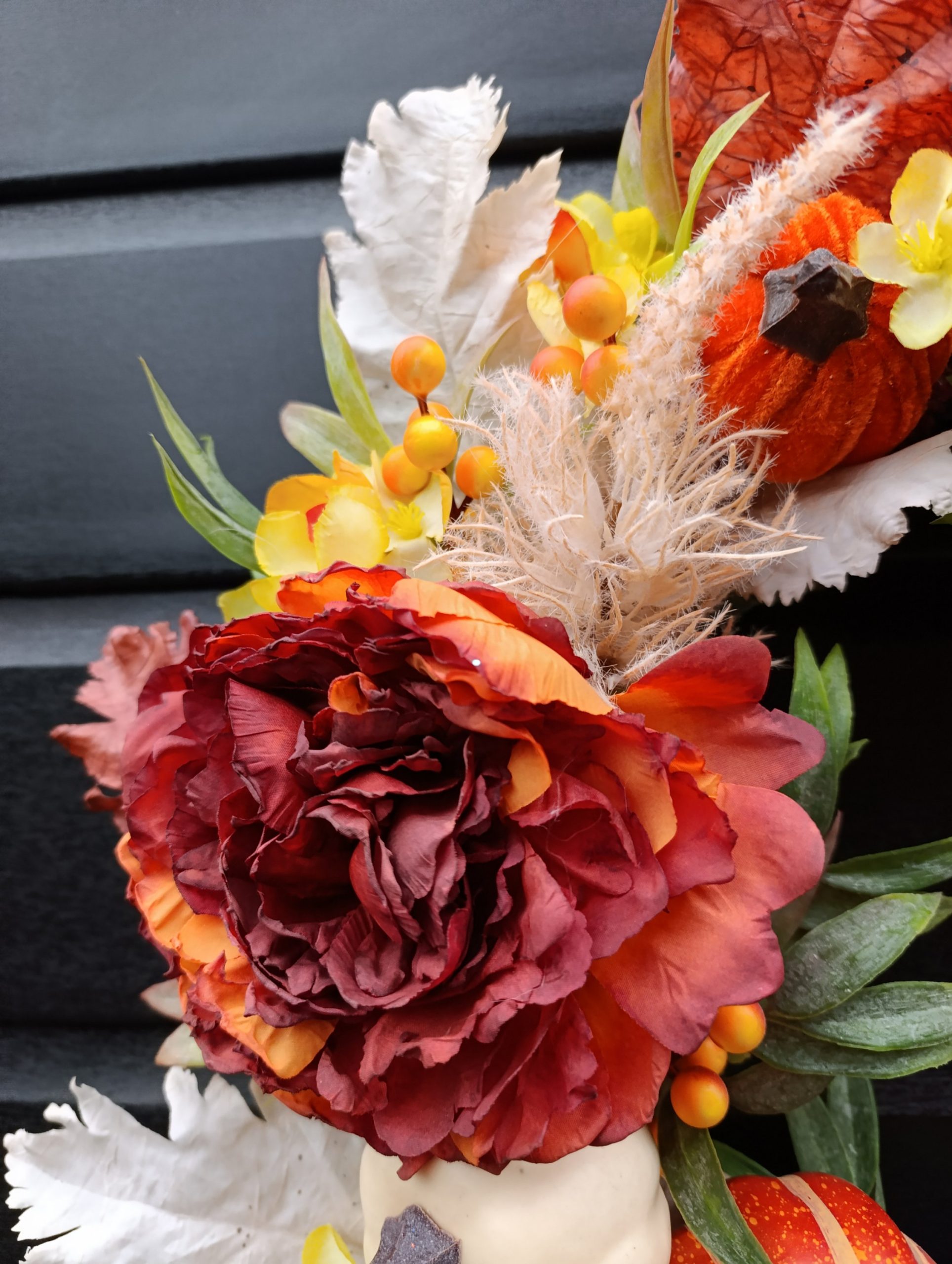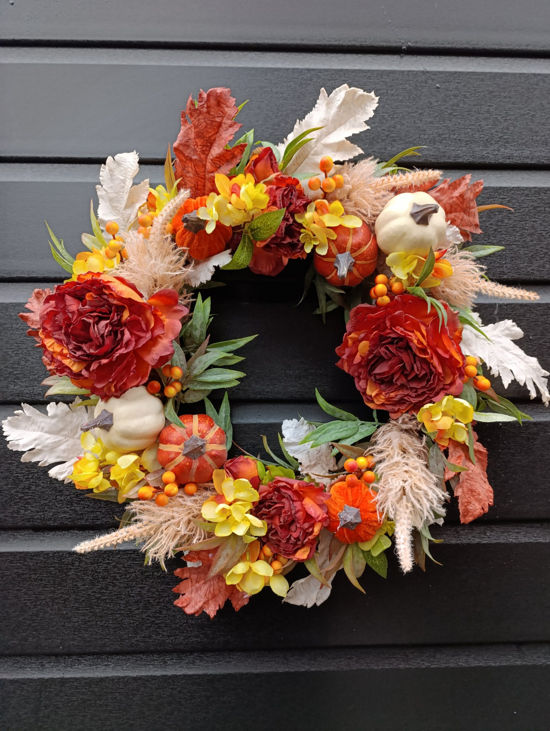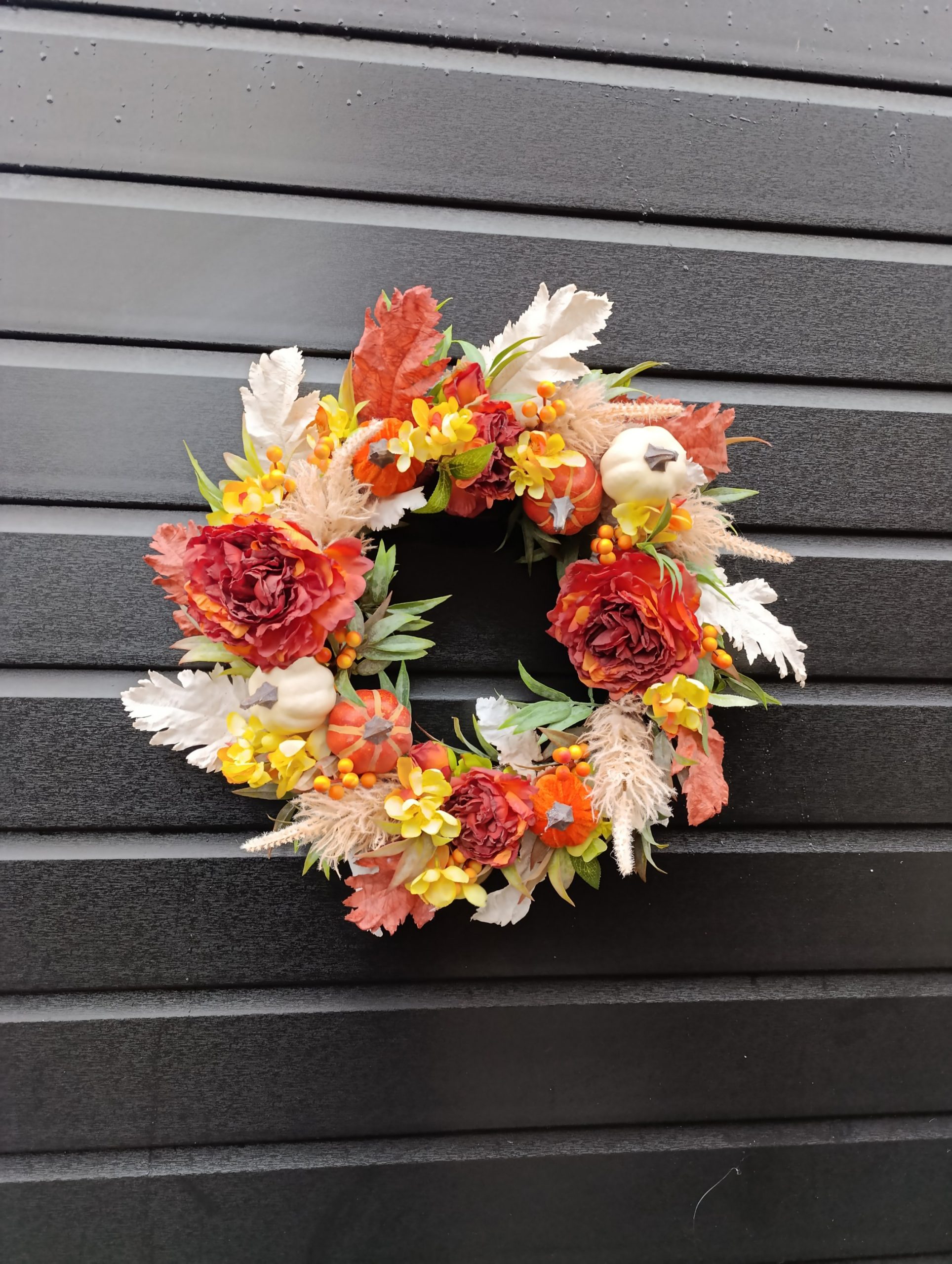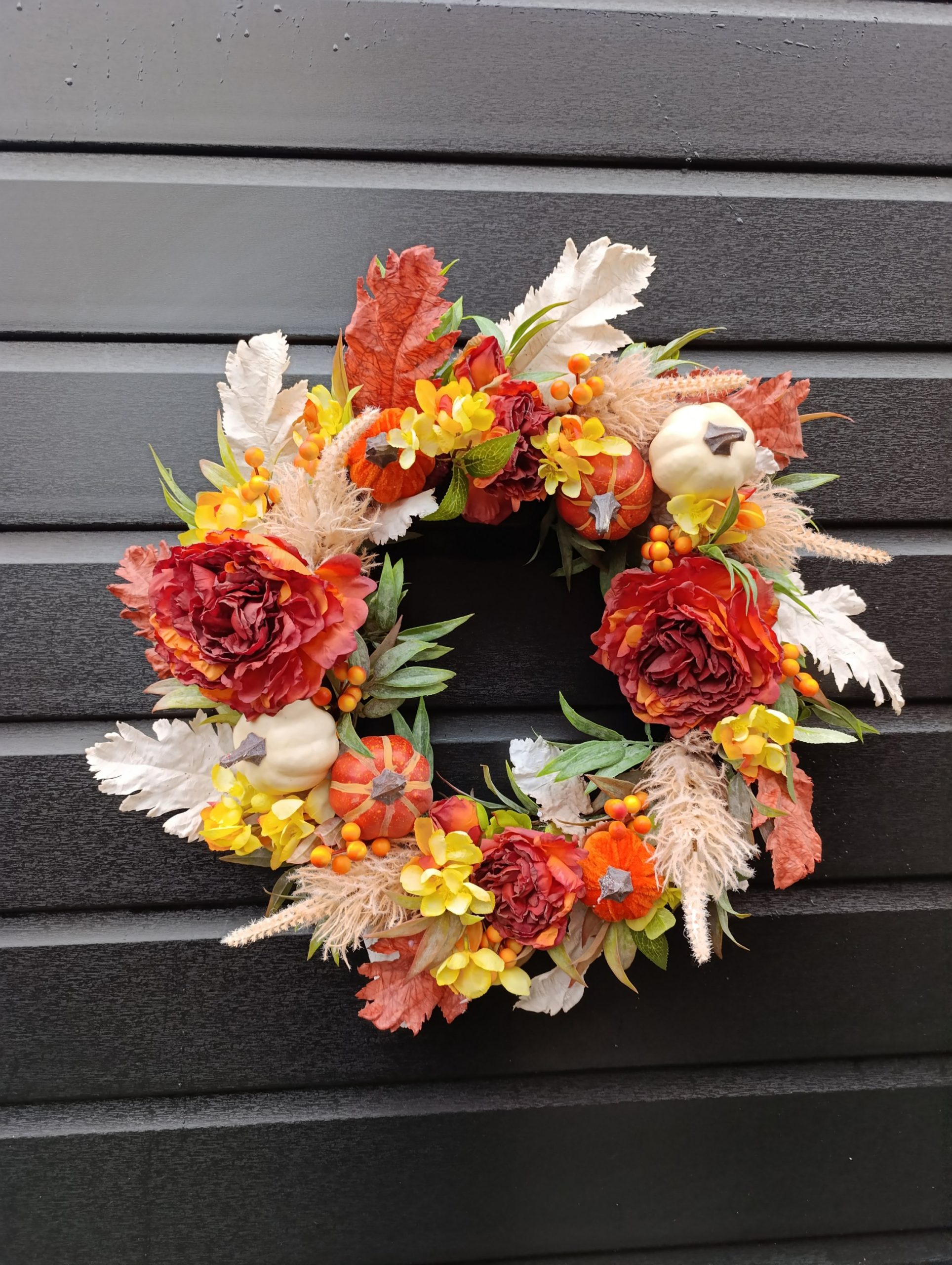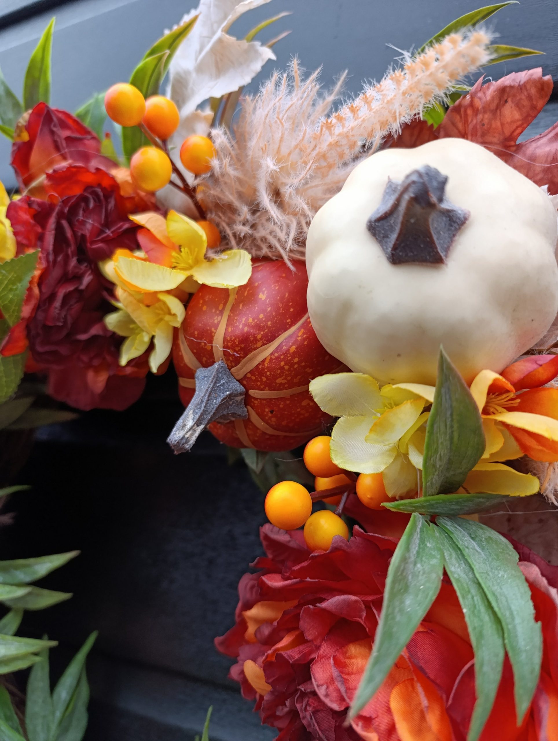 Contemporary style autumn wreath. Constructed on a natural grapevine wreath base, this handmade fall wreath will look stunning on any door.