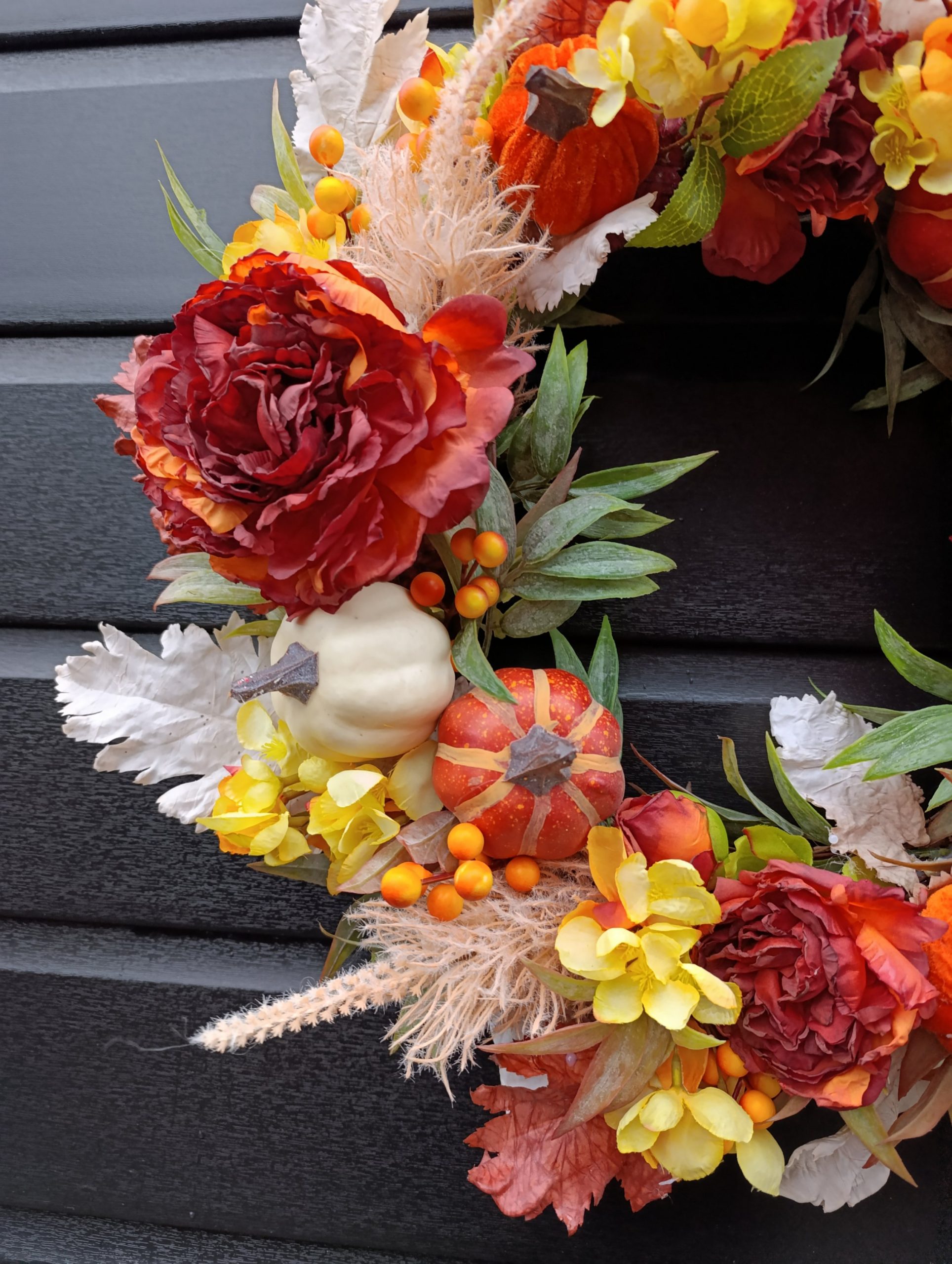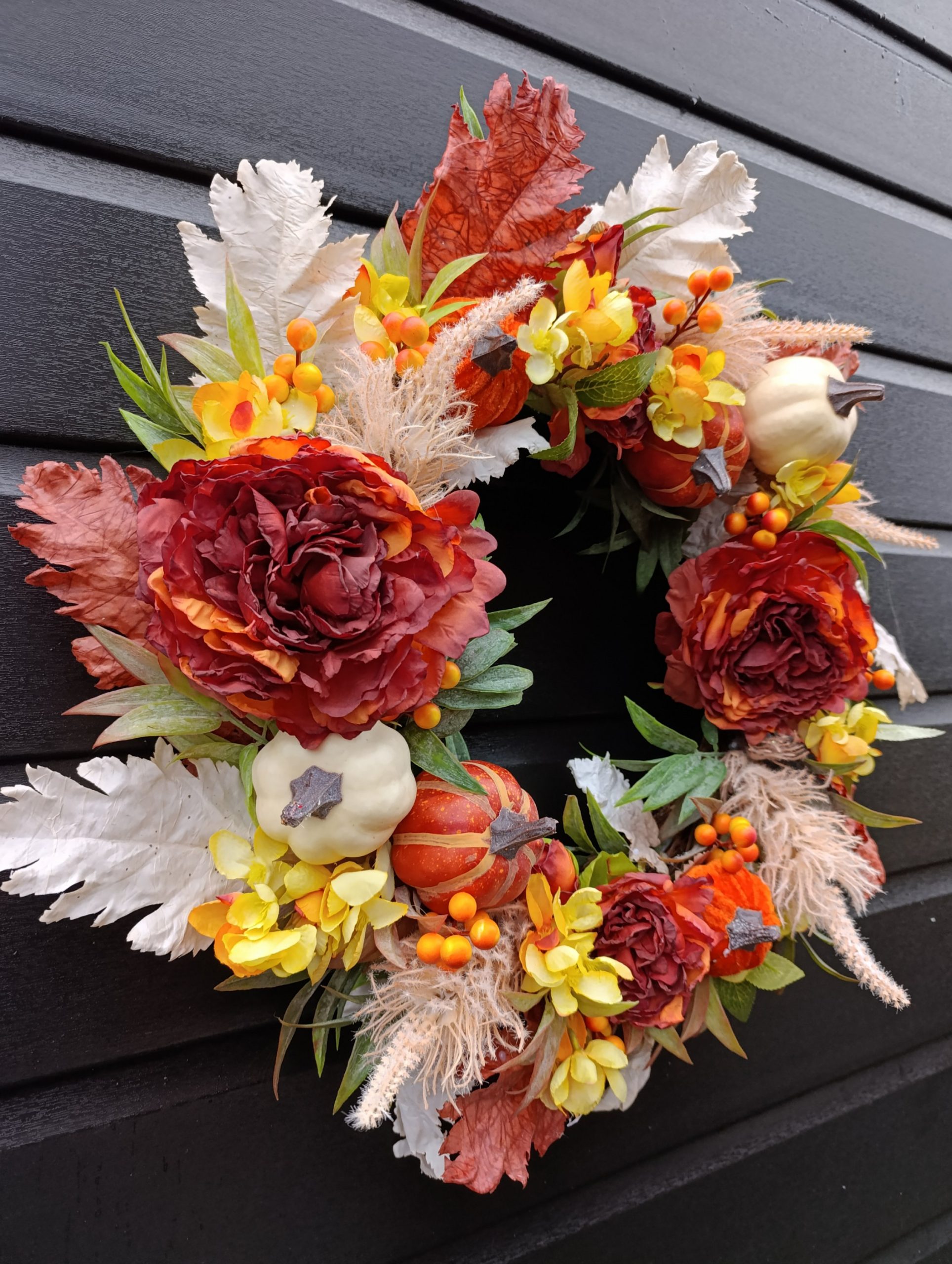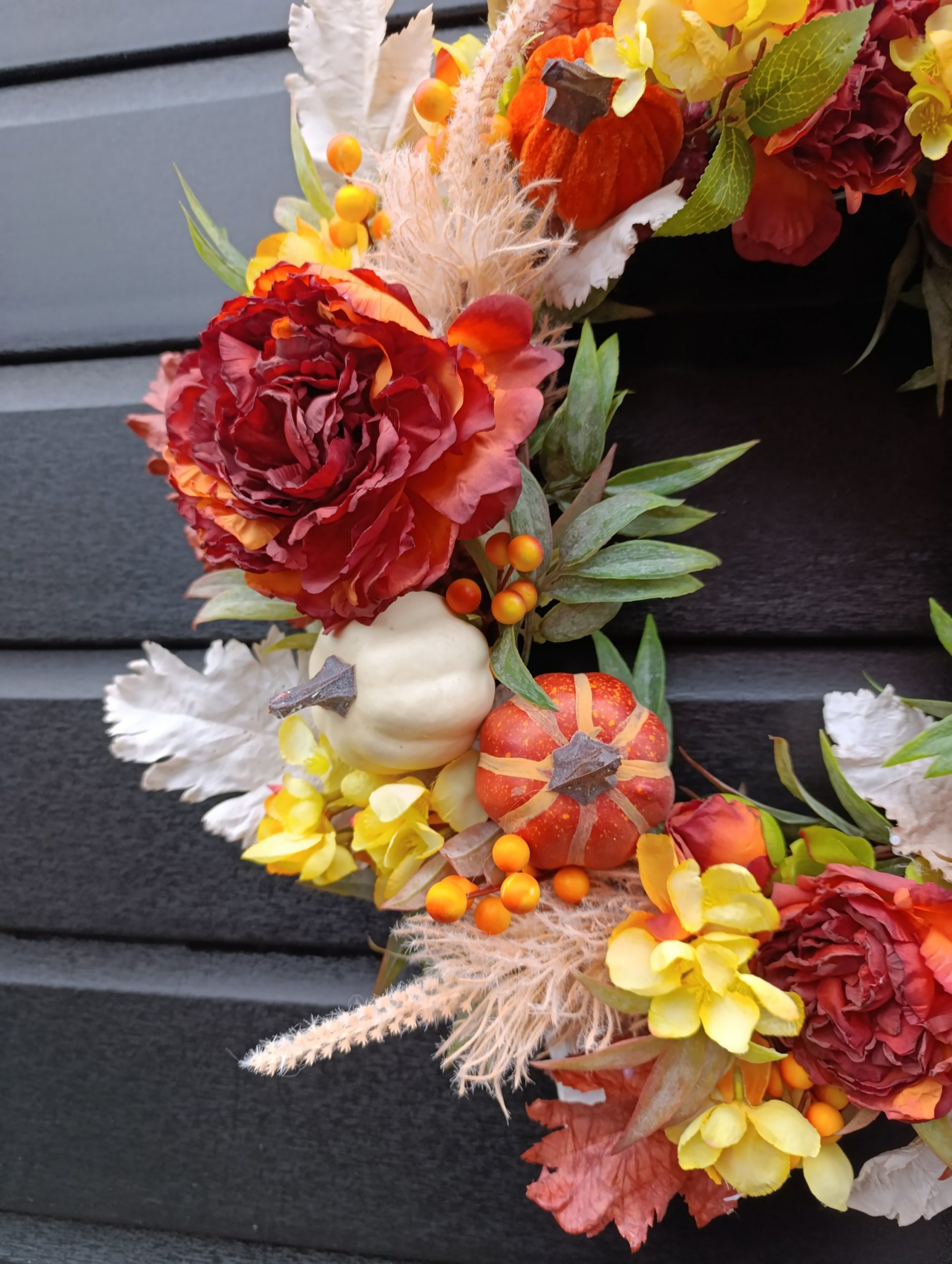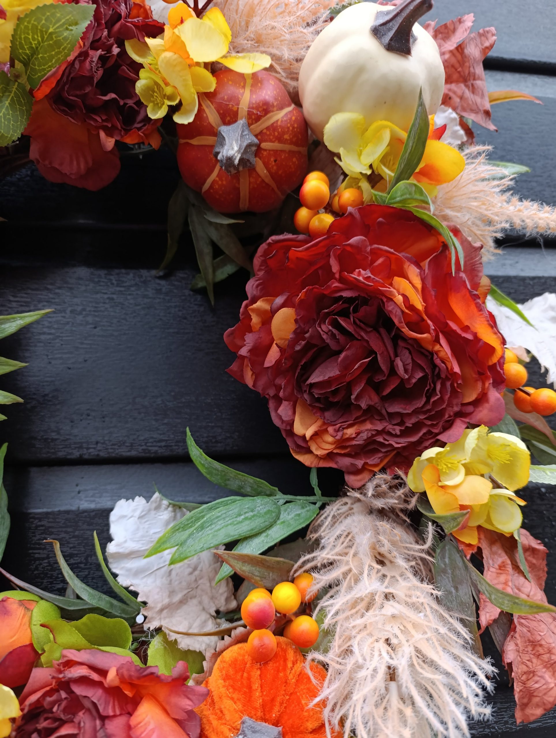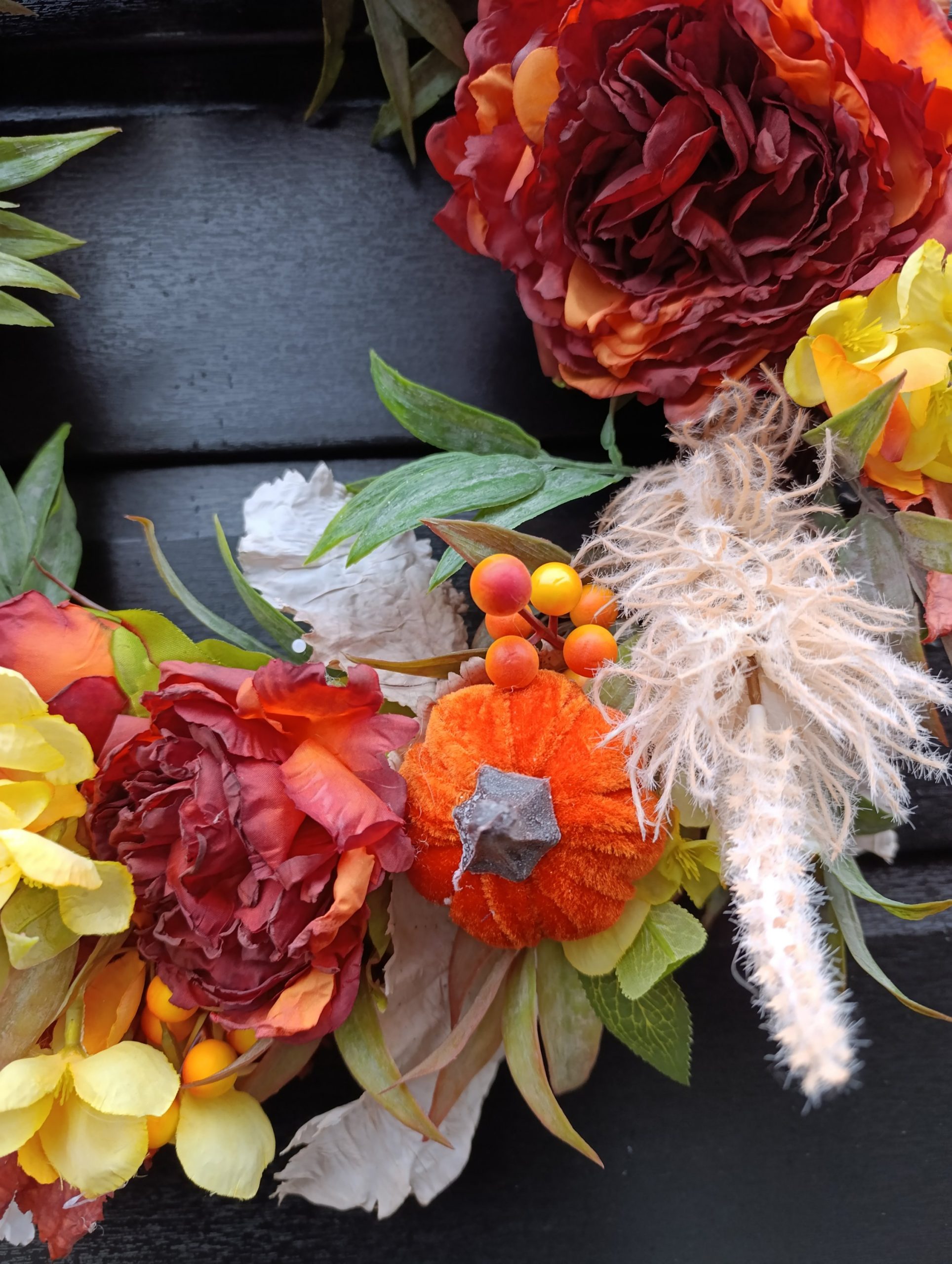 Measuring 50cm in diameter and full of quality faux dried touch florals and foliage. The wreath also contains artificial pumpkins in coordinating autumnal tones.