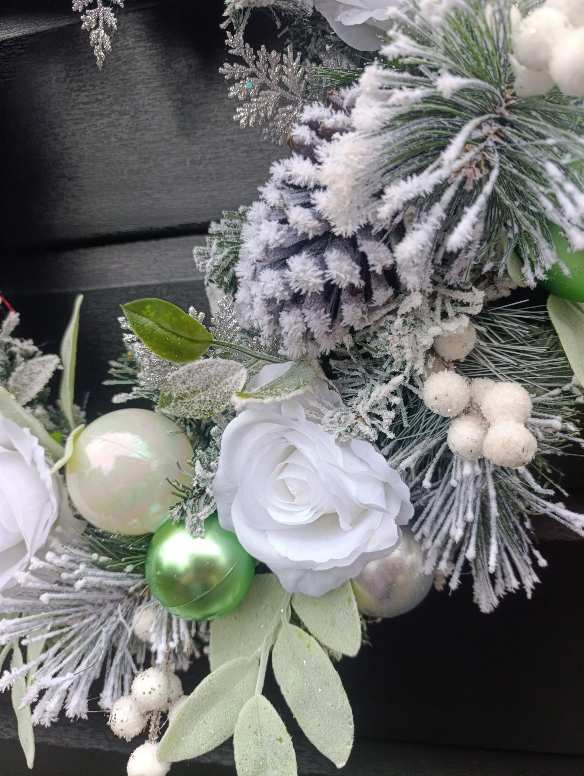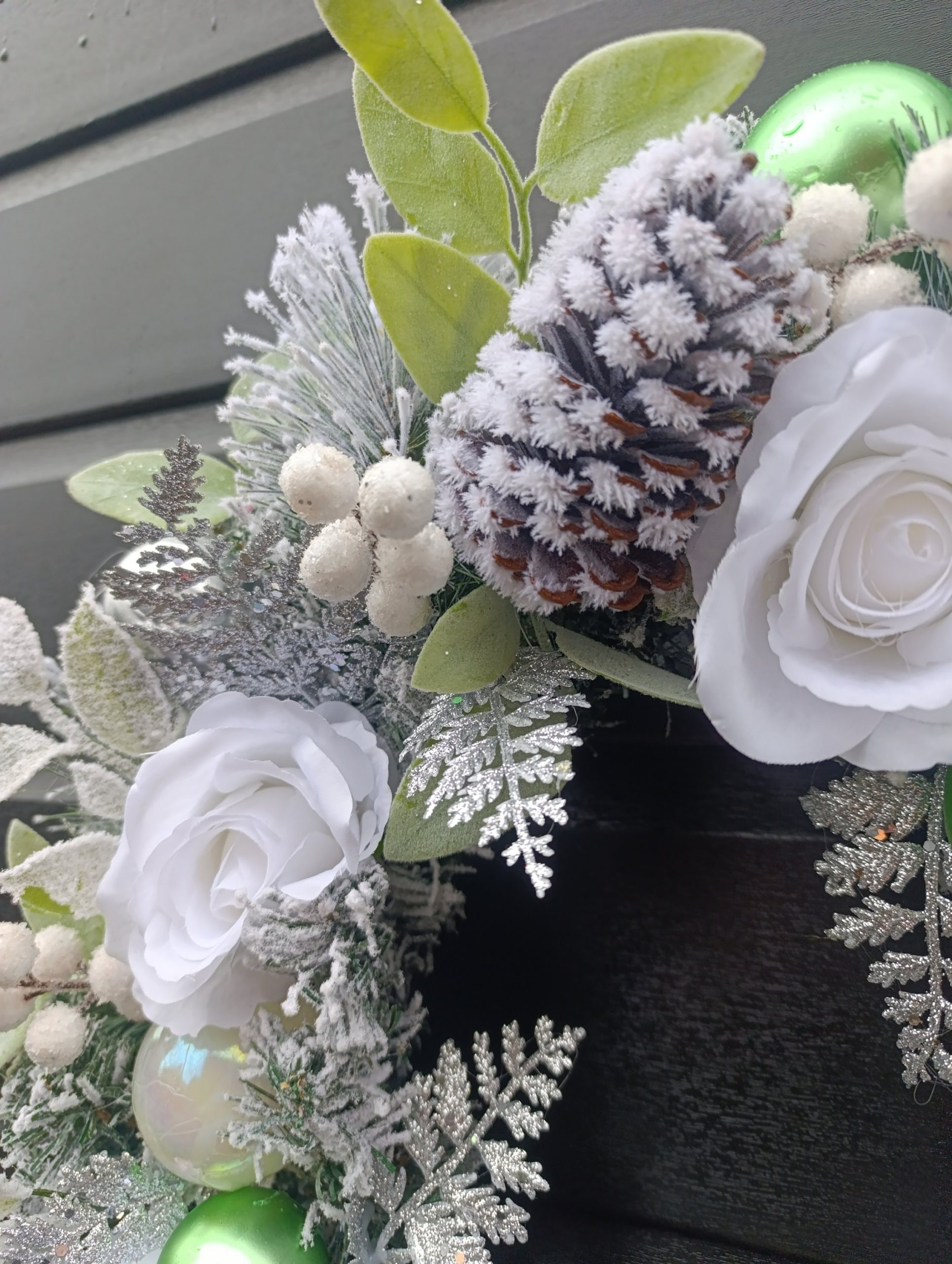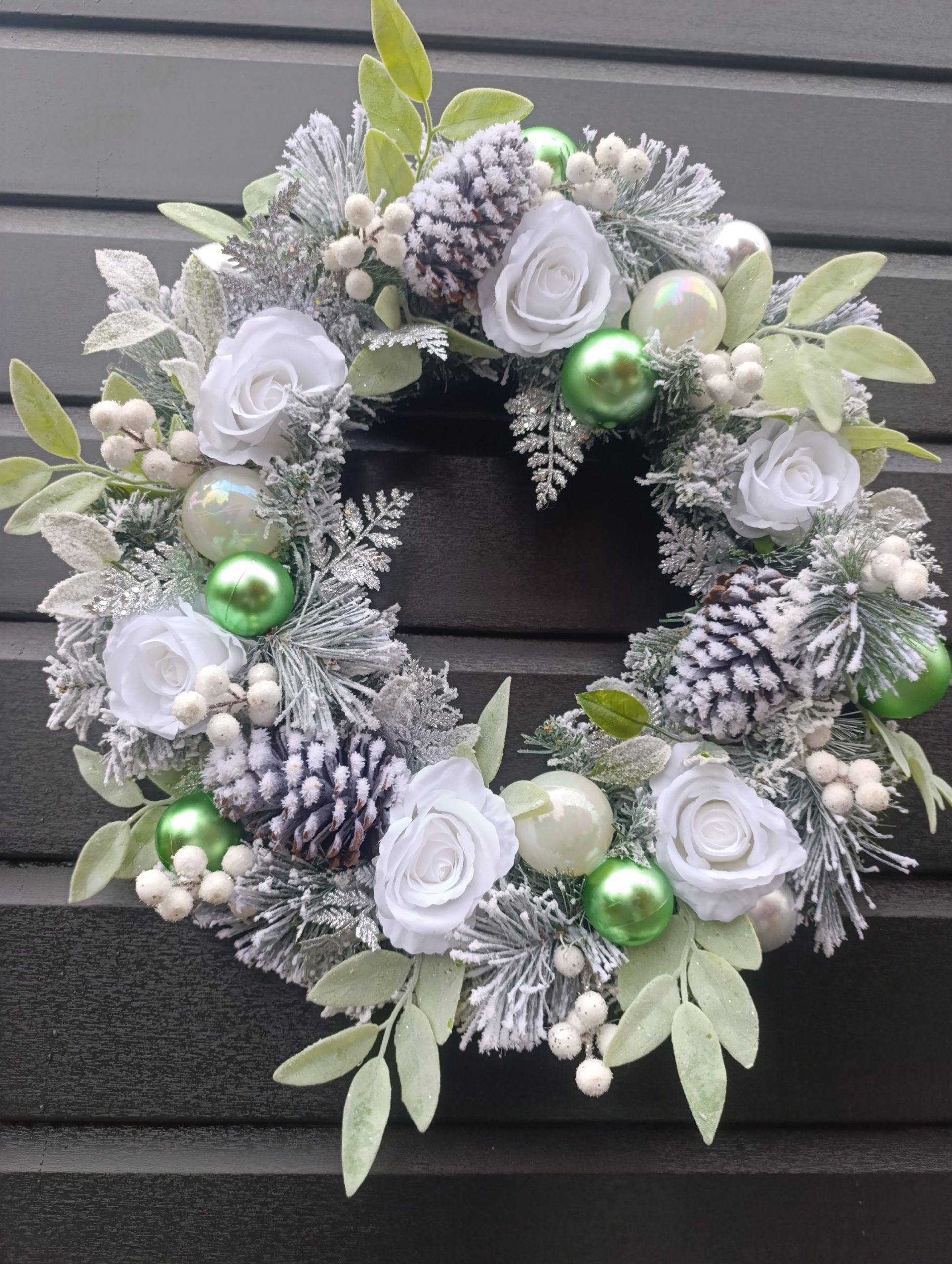 Adorned with crisp white roses, silver and green baubles, avalanche berries, silver ferns and flocked snowy spruce, this wreath will stand out on any front door colour.