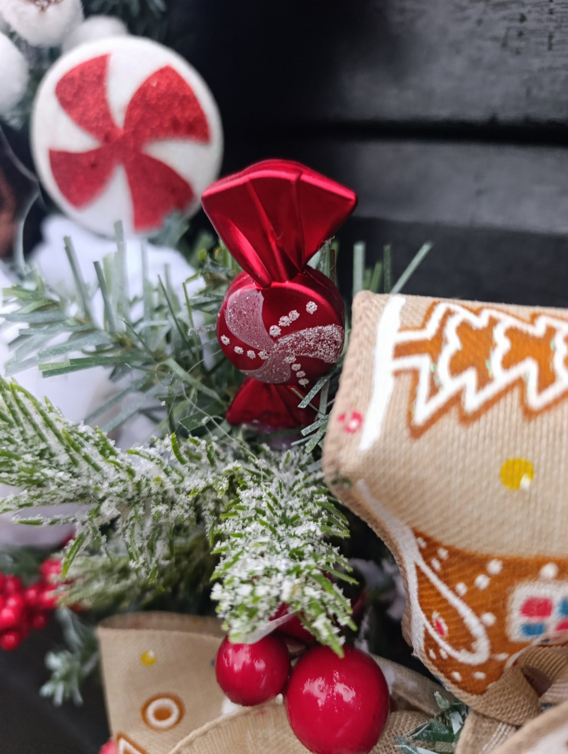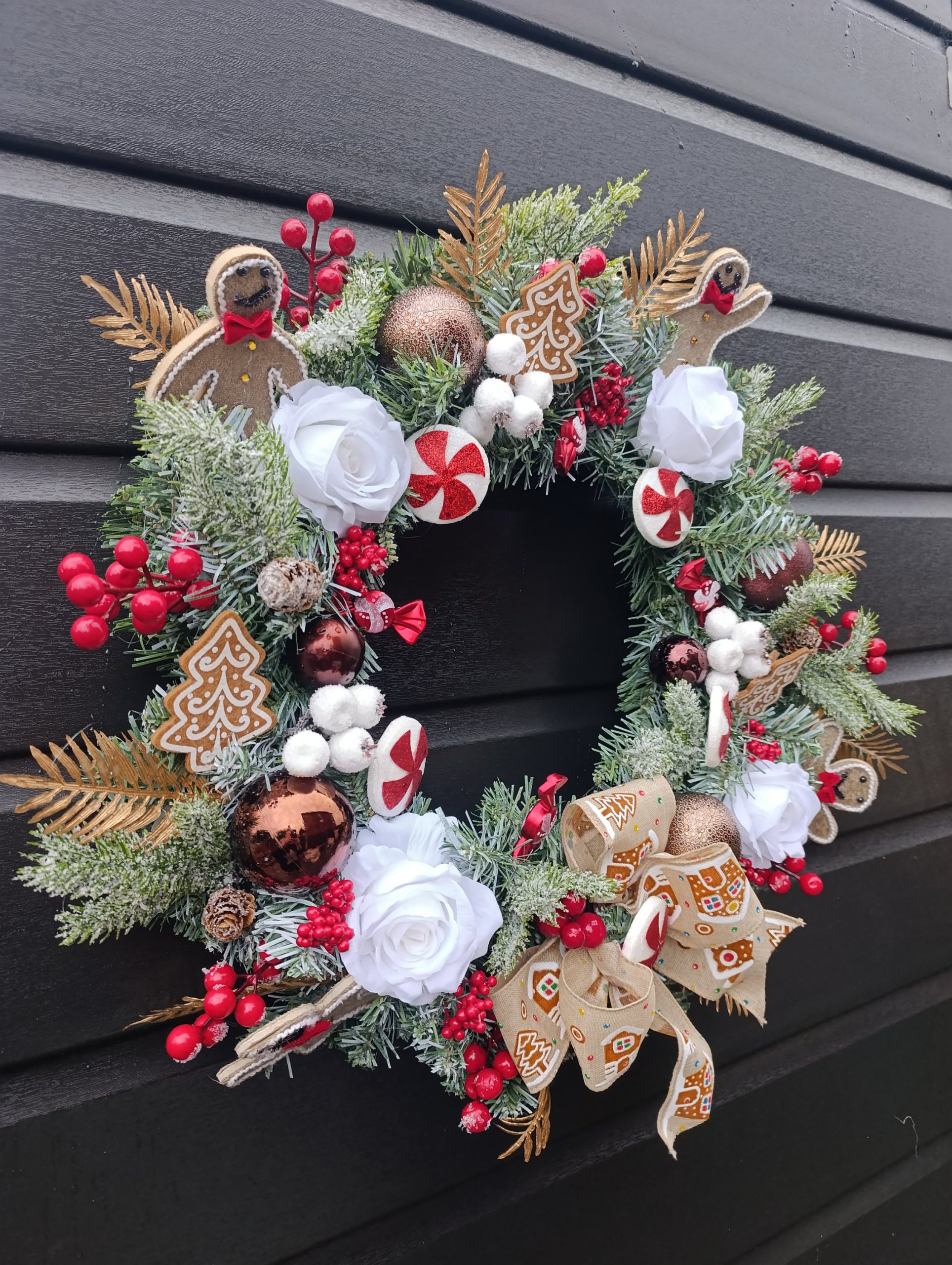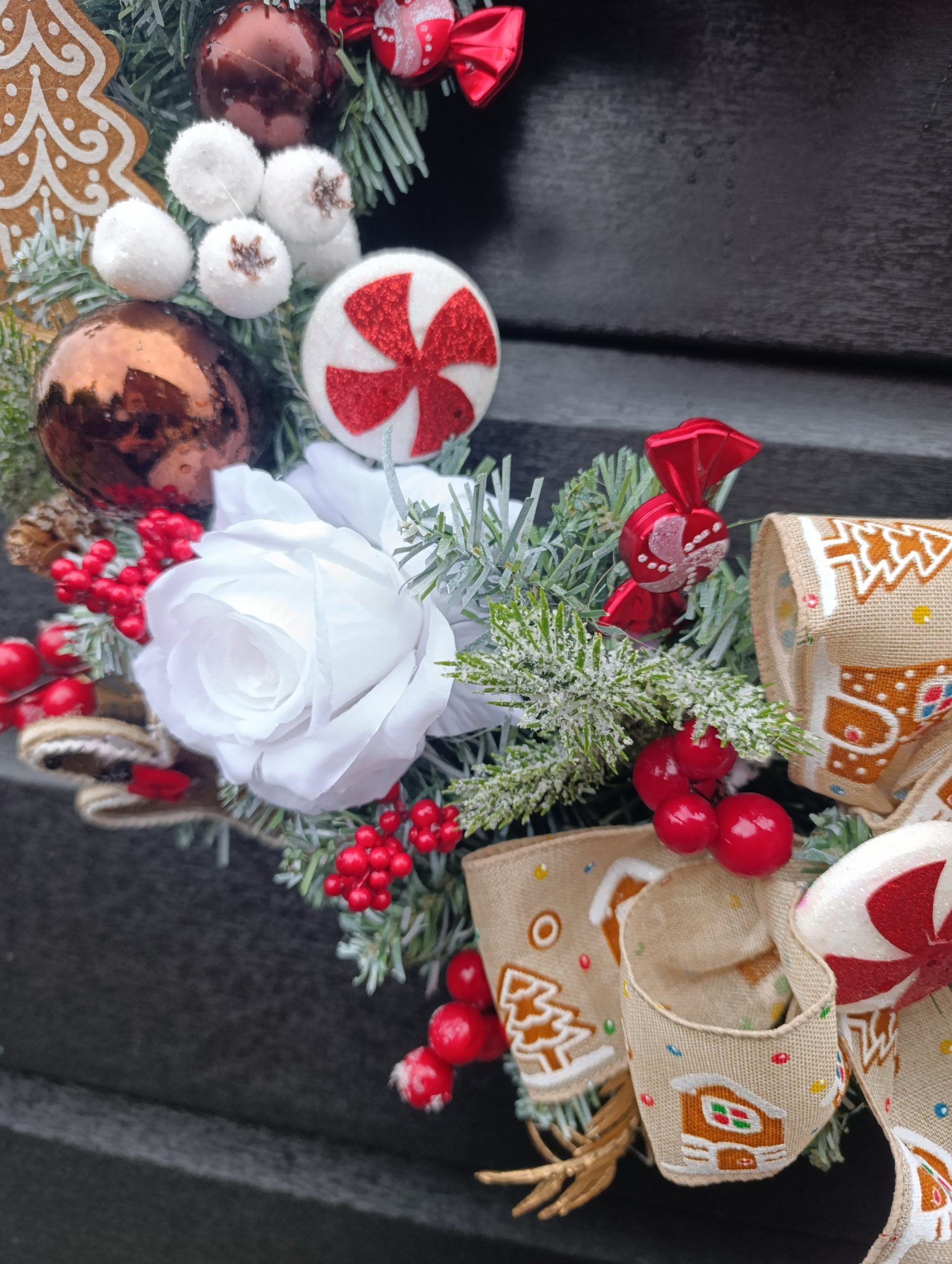 Gingerbread Christmas Wreath 50cm Handmade – Snowy Spruce, White Roses, Gold Foliage, Candy Canes & Gingerbread Men