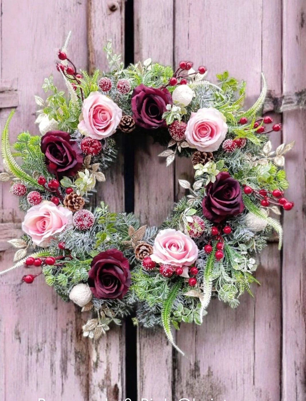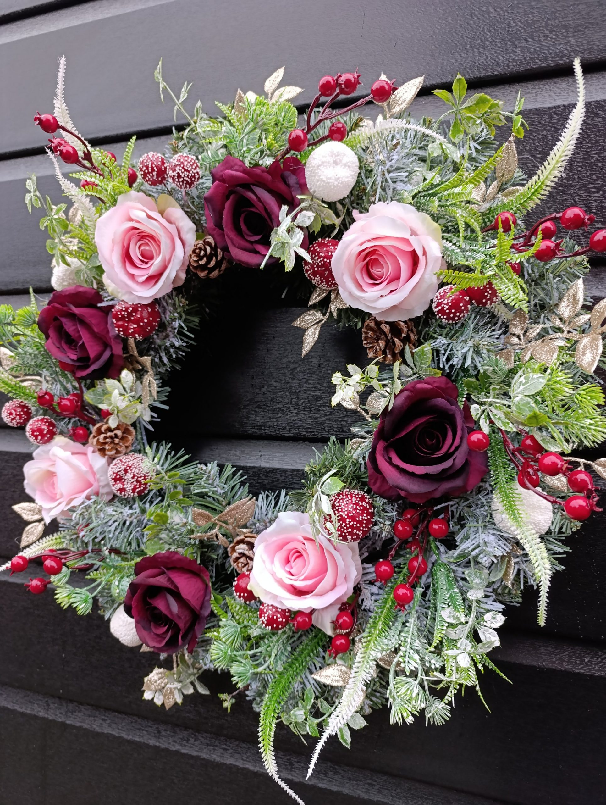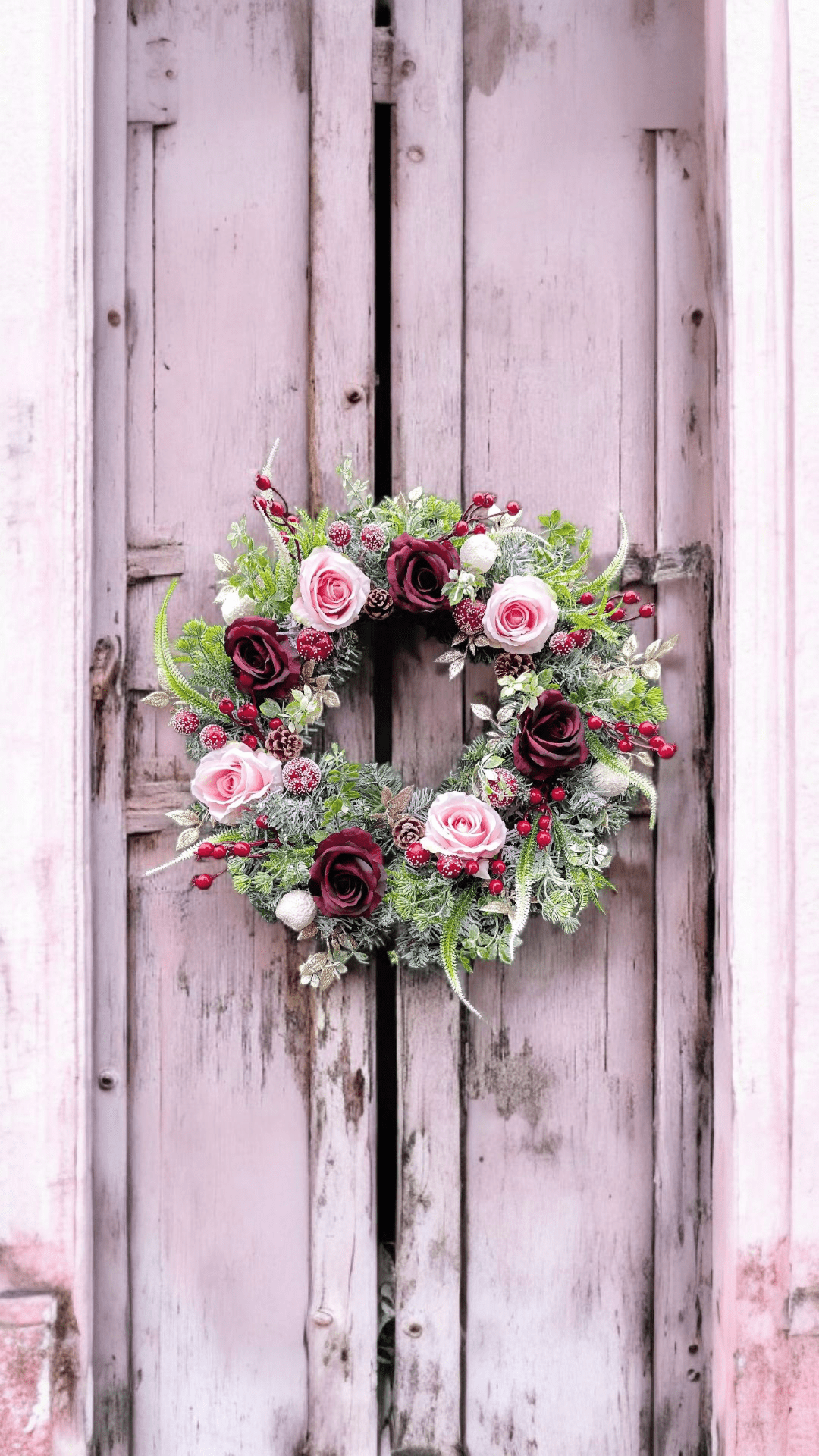 The design is brought to life with high-quality artificial roses in on-trend burgundy and pale pink tones, adding warmth and sophistication. Natural pine cones, red berries, and frosted red and white fruits complete the look, offering a classic seasonal feel with a touch of contemporary elegance.
